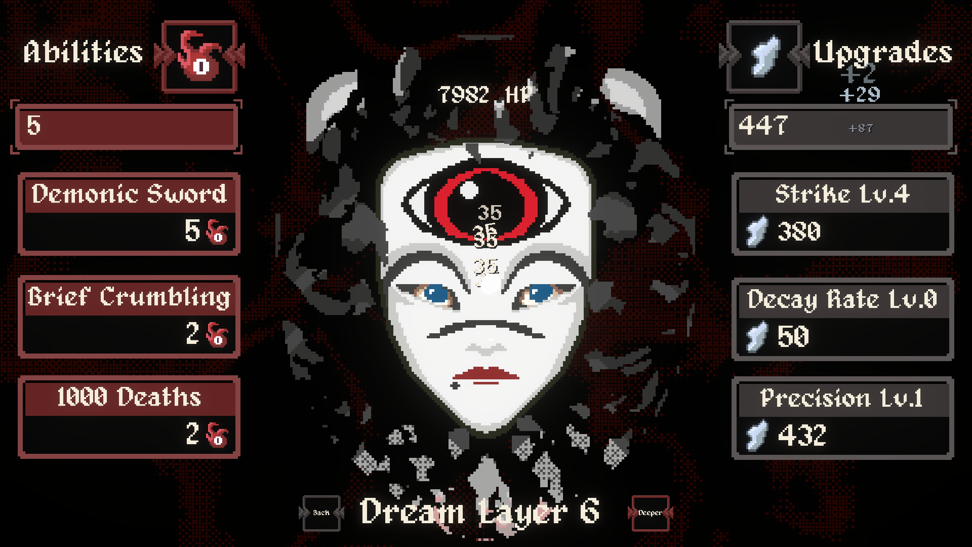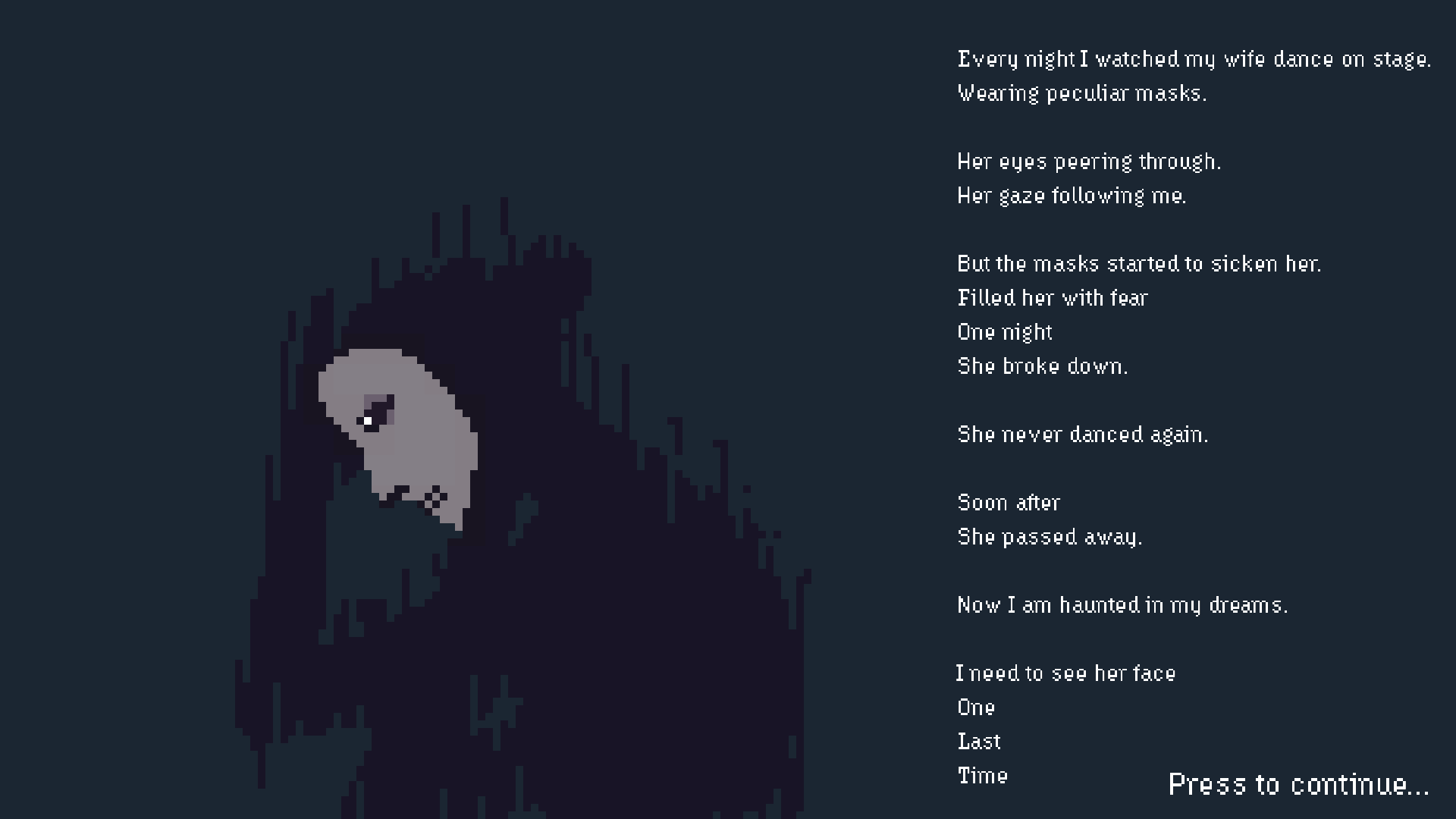In this clicker game you play as a man who lost his wife. He is haunted by the masks she used to wear while dancing, while desperately trying to catch a glimpse of her face behind them one last time. Satisfyingly crack the masks open, grow stronger and uncover the truth behind the man's nightmares.